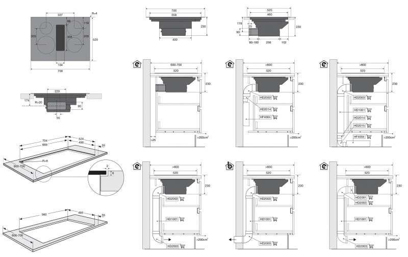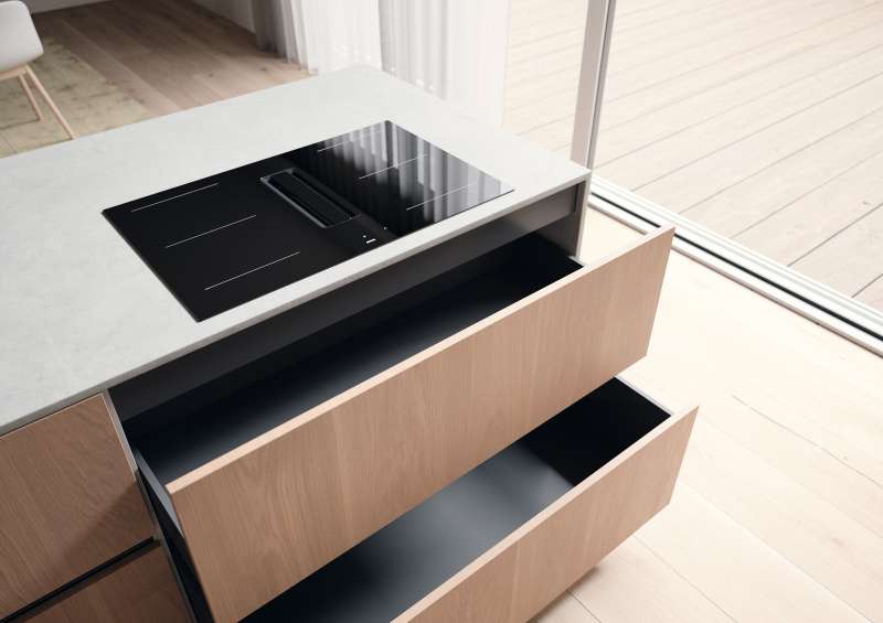 De afmetingen van het systeem zijn zo ontwikkelt, dat de HIDD07471EX / HIDD07472EX passen in een standaard nis (56x49cm). Deze maat komt veel voor bij 60cm kookplaten. Hierdoor zijn de genoemde modellen ideaal om in bestaande situaties of compactere keukens met een standaard 60cm kasten te plannen. De HIDD08471EX / HIDD08471EVX zijn toe te passen in kasten vanaf 80cm en groter. Deze serie kookplaten met geïntegreerde afzuiging zijn dus met recht in iedere keukenontwerp toe te passen!
