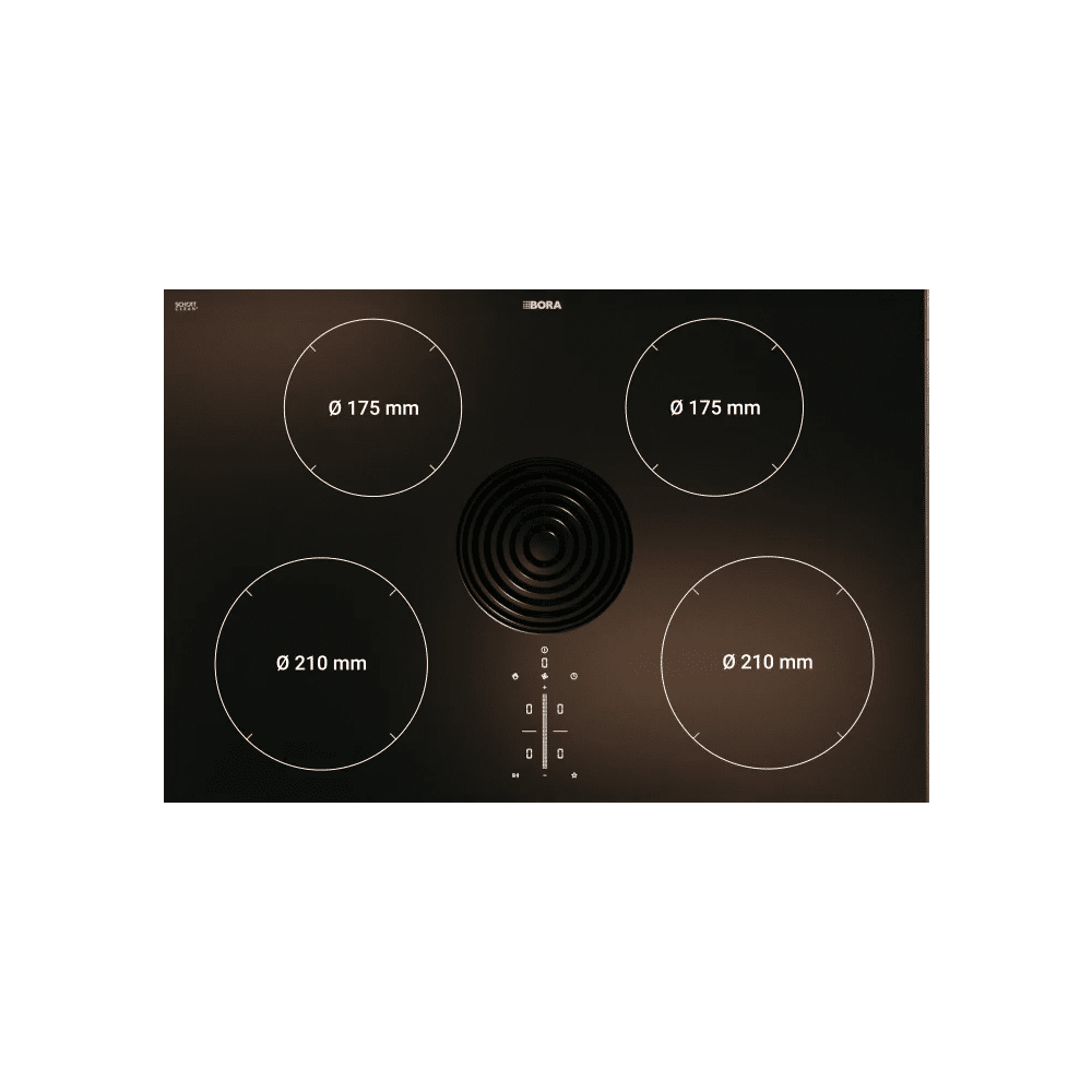 De BORA Pure maakt gebruik van vier ronde inductiezones in twee maten om de volledige kookvelddiepte van 51,5 cm efficiënt te benutten. De achterzones zijn ideaal voor kleinere pannen, en de voorste zones voor grotere kookgerei.