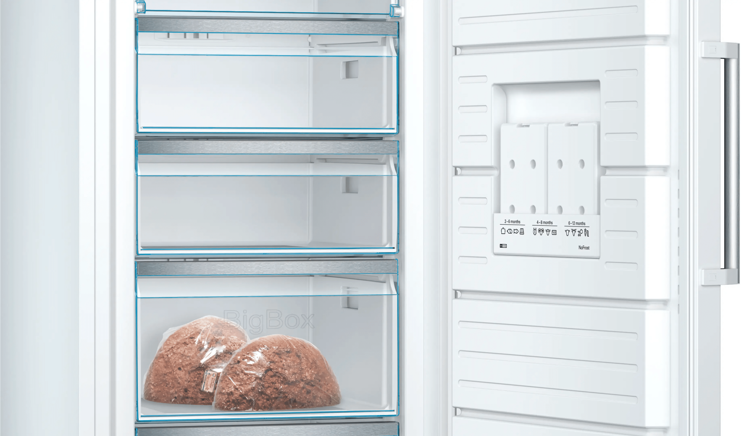 Met VarioZone kun je glazen plateaus eenvoudig verwijderen voor extra ruimte. De BigBox-lade biedt daarnaast plek voor grotere producten zoals pizzadozen of stapelbakken.