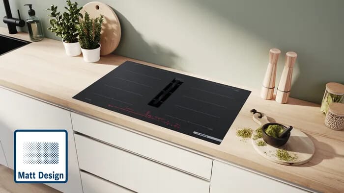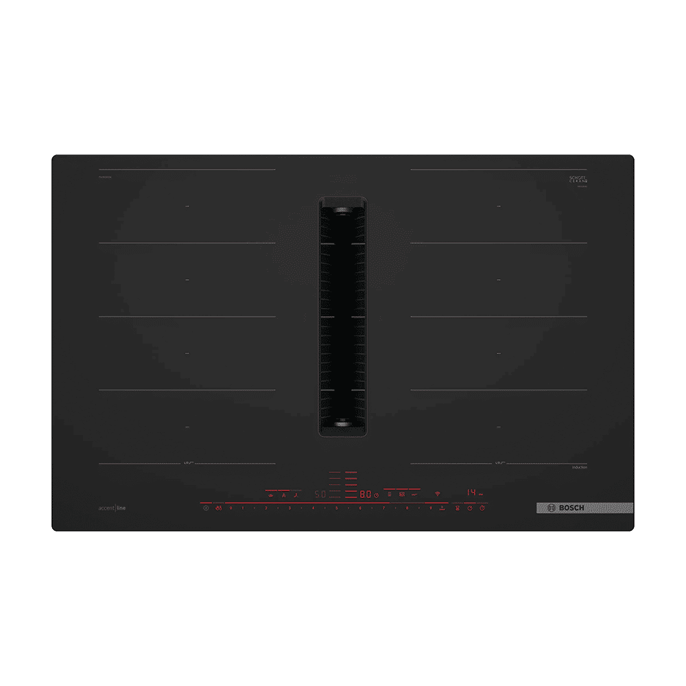 De Bosch PXX82BD56E is een premium inductiekookplaat met geïntegreerd afzuigsysteem uit de Serie 8 van Bosch Home Appliances. Dit innovatieve 2-in-1 apparaat combineert krachtige inductiekooktechnologie met een geavanceerd ventilatiesysteem, zodat je kunt koken én direct geuren en dampen kunt afzuigen zonder een aparte afzuigkap boven je kookplaat te hoeven installeren.