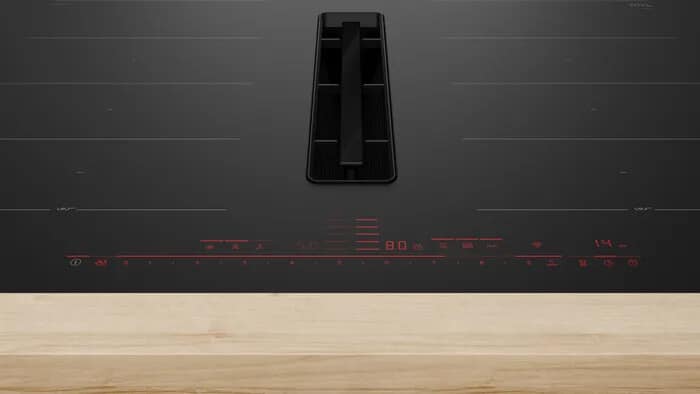 Het ingebouwde afzuigsysteem verwijdert kookdampen direct bij de bron met een maximale afzuigcapaciteit van ca. 500 m³/uur in de normale stand. Zo blijft de lucht in de keuken fris, zonder extra afzuigkap boven je kookplaat.