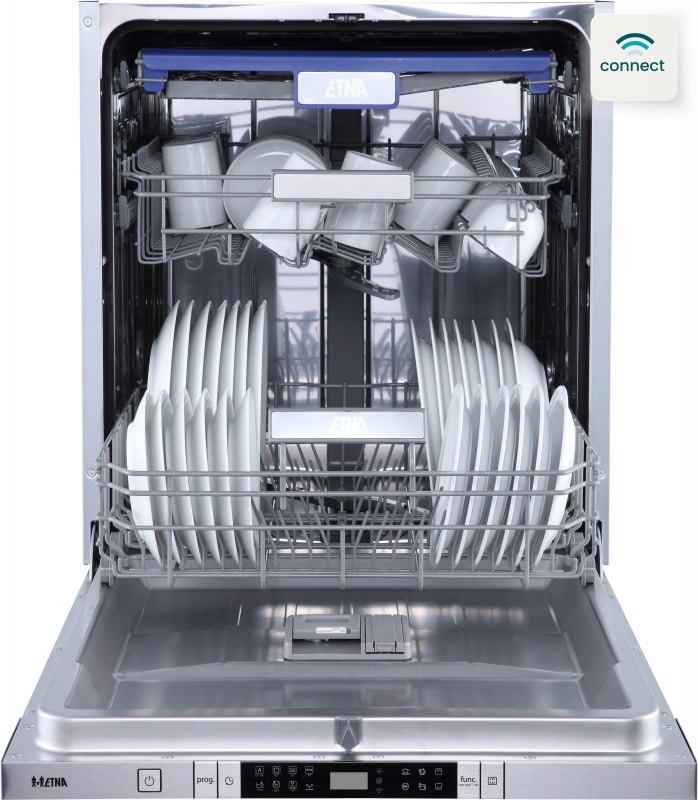 De VW740NC is uitgerust met een koolborstelloze motor, dit maakt hem zuiniger in energieverbruik en stil. Met een geluidsniveau van slechts 40 dB(A) en een energieklasse B zit je met dit model dus goed. De VW740NC biedt ruimte voor 14 couverts. Doordat de bovenste korf in hoogte verstelbaar is, ben je extra flexibel met het inruimen, zelfs wanneer de korf al beladen is. Je hebt dus zelf in de hand of je wat meer ruimte in de onderste of bovenste korf kunt gebruiken. De VW740NC is voorzien van een flexibele derde besteklade, waardoor je extra veel ruimte overhoud voor borden en pannen in de onderste korf. Wil je jouw vaat op een duurzame wijze extra droog laten worden, dan kun je kiezen voor de automatische deuropening. Of je kiest voor de extra droog functie, een van de vele extra functies die beschikbaar zijn op dit model. Je hebt ook de keuze om een PowerWash, self clean, turbo speed of DualWash functie te selecteren. Deze laatste geeft je de optie om de vaatwasser op halve belading te laten draaien; je kies dan zelf of je de bovenste of onderste korf laat reinigen. Om het model helemaal af te maken is deze voorzien van led-binnenverlichting. Voor extra gebruiksgemak is de ETNA VW740NC koppelbaar met de ETNA Connect App. Dit stelt je als gebruiker in staat favoriete programma’s in te stellen en de status van je vaatwasser op afstand te volgen. Ook geeft de app je hulp bij vragen over het apparaat of meldingen.
