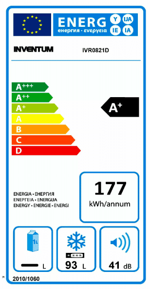 Inventum IVR0821D. Nettocapaciteit vriezer: 95 l, Klimaatklasse: SN, Vriescapaciteit: 9 kg/24u, Bewaartijd bij stroomuitval: 18 uur, Geluidsniveau: 39 dB, Aantal sterren: 4*. Deurscharnieren: Rechts. Jaarlijks energieverbruik: 178 kWu. Kleur van het product: Wit