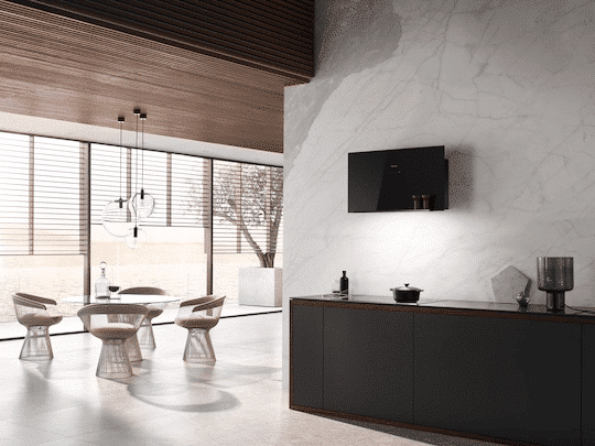 Wandschouwafzuigkap met verticaal glazen front en bijzonder vlak design voor meer ruimte.