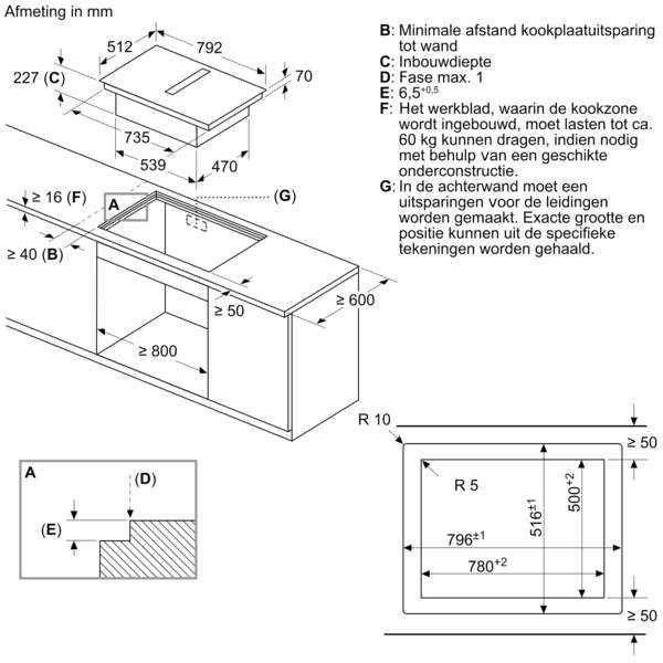 | Inbouwmaten (hxbxd mm): 227 x 796 x 516 |